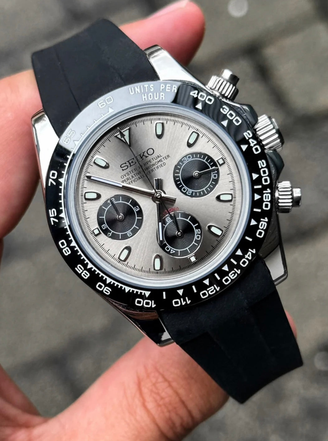 Handcrafted and assembled by our in-house watch experts, the Seiko Daytona Mod is powered by the VK63 movement, offering reliable chronograph functionality. Inspired by the iconic Daytona design, this mod features the signature tachymeter bezel and sleek dial, embodying the spirit of speed and precision. With its robust stainless steel case and timeless aesthetic, this watch is a tribute to racing heritage, perfect for those who appreciate performance-driven style.